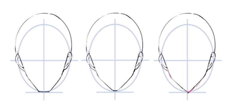 위 그림을 보면 턱의 표현을 3가지로 나누어 그렸는데, 아랫쪽 턱의 수평 부분의 길이에 차이가 있음을 알 수 있을 것이다.