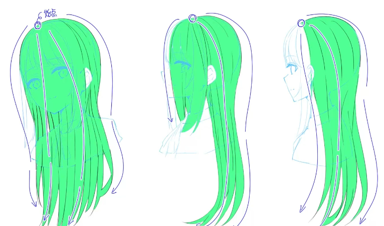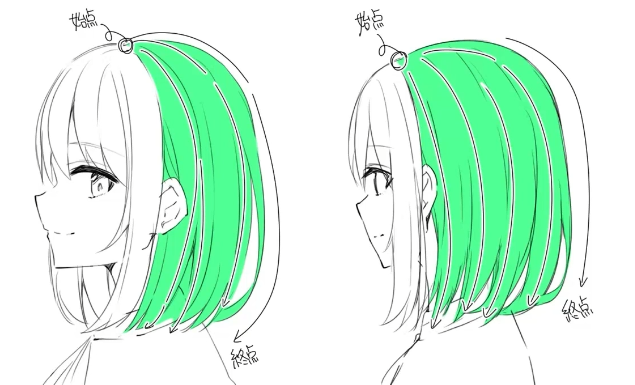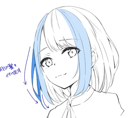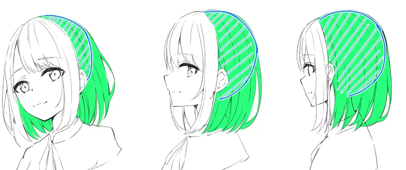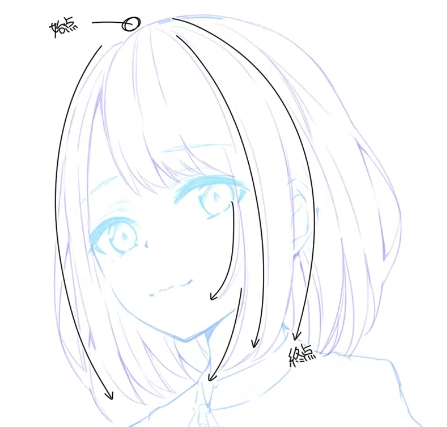 그렇다고 그리는 법이 완전 다른것이 아니다. 앞서말한 앞머리와 비슷한 형태이기에 가마에서부터 시작해서 하나로 이어진 느낌으로 그려나가면 된다.