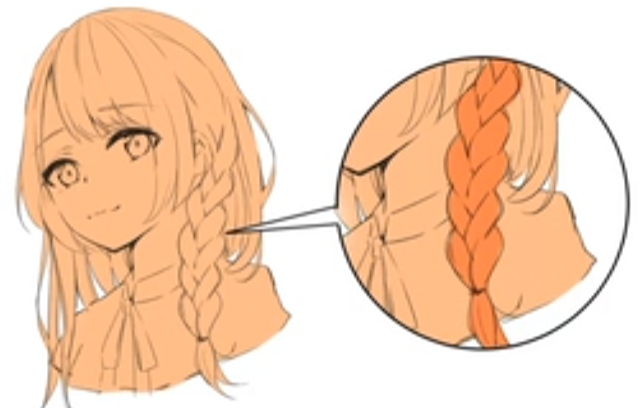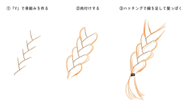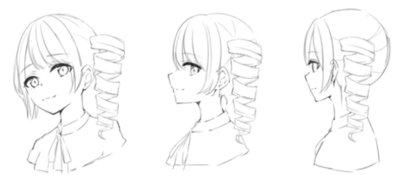 앞서 소개한 묶은 머리와 형태는 같지만, 달려있는 형태가 매우 특별하다. 따라서 저걸 그리기위한 기교가 새롭게 필요한데, 안쪽면과 밖면을 의식하면서 구성하는게 중요하다. 그리고 그 두꺠는 일정한데, 그림을 보면서 설명하겠다.