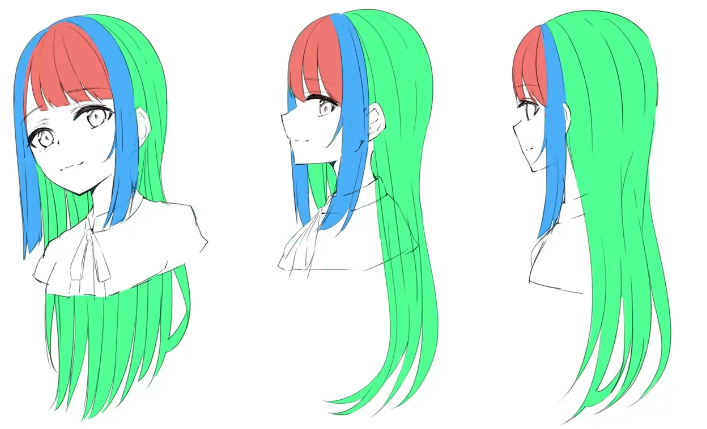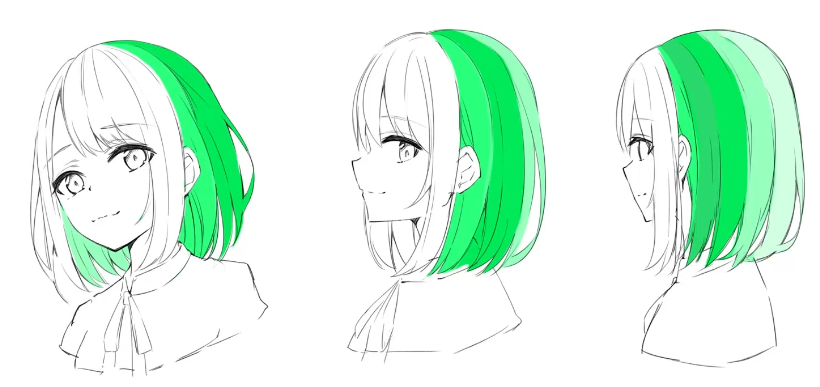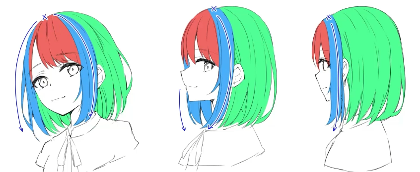 이제 머리카락에대한 구별과 처리법에대해서 대략적으로 알았을텐데, 이것을 인지한 상태로 다른 해어스타일을 그릴떄 어떤 생각을 가지고 그리면 되는지를 알아보자.