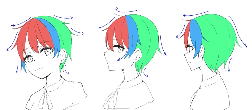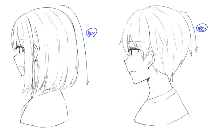 기본적으로 그리는 형태는 비슷하나 헤어스타일의 특징이 존재한다. 숏컷같은경우는 머리카락이 짧기에 무게 중심이 아래로 치우쳐지지 않기에, 튀어나오는 머리가 생겨난다. 과거 앞머리의 설명에서 말했듯, 무개중심이 가마와 가까워지면 볼륨감있는 곡선이되는 원리와 같다. 따라서 머리에 삐죽삐죽 튀어나오는 형태의 구성이 된다.