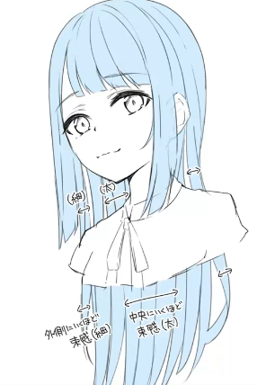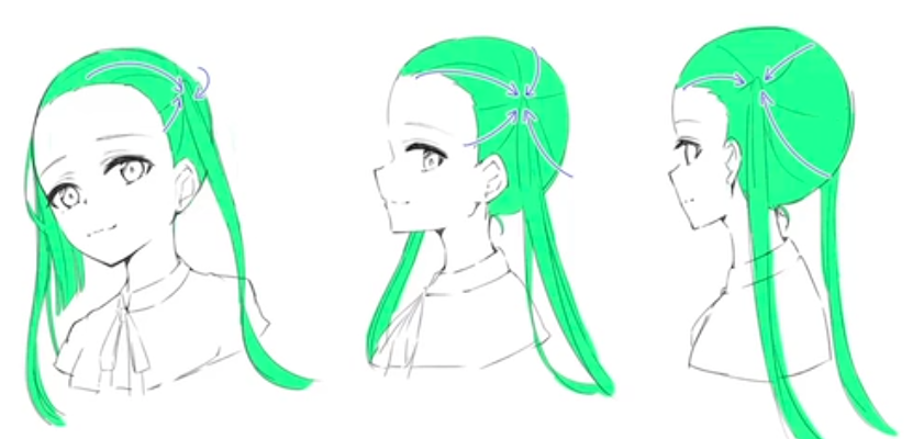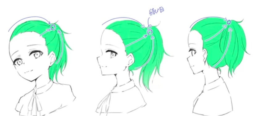위 그림과같이 머리카락이 나는 부분을 시작으로 머리가 묶인 부분까지 의식해서 그리면된다. 또한 묶인 부분에서부터 가마를 기준으로 작업한 것처럼, 머리카락을 뽑아내는 형태로 작업하면된다. 여기서 주의할점은, 외곽선이 가장 뚜렷하게 들어나는 헤어스타일임으로, 외곽선을 직선으로 구성하지 않고 선을따라 곡선으로 그려주는 것이다.