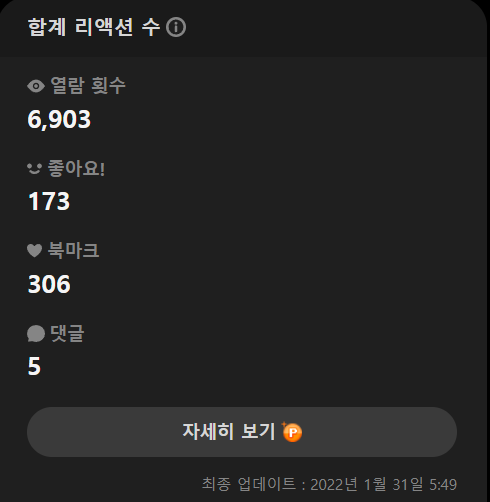 열람 횟수가 1,000천 정도 늘었지만, 좋아요나 북마크가 50%이상의 성장을 이루었다. 열람이 20%증가한거에 비해서 큰 성장률인걸 알 수 있다. 역시 이러한 것을 보면 그림그리는 것이 은근히 재미있다.
