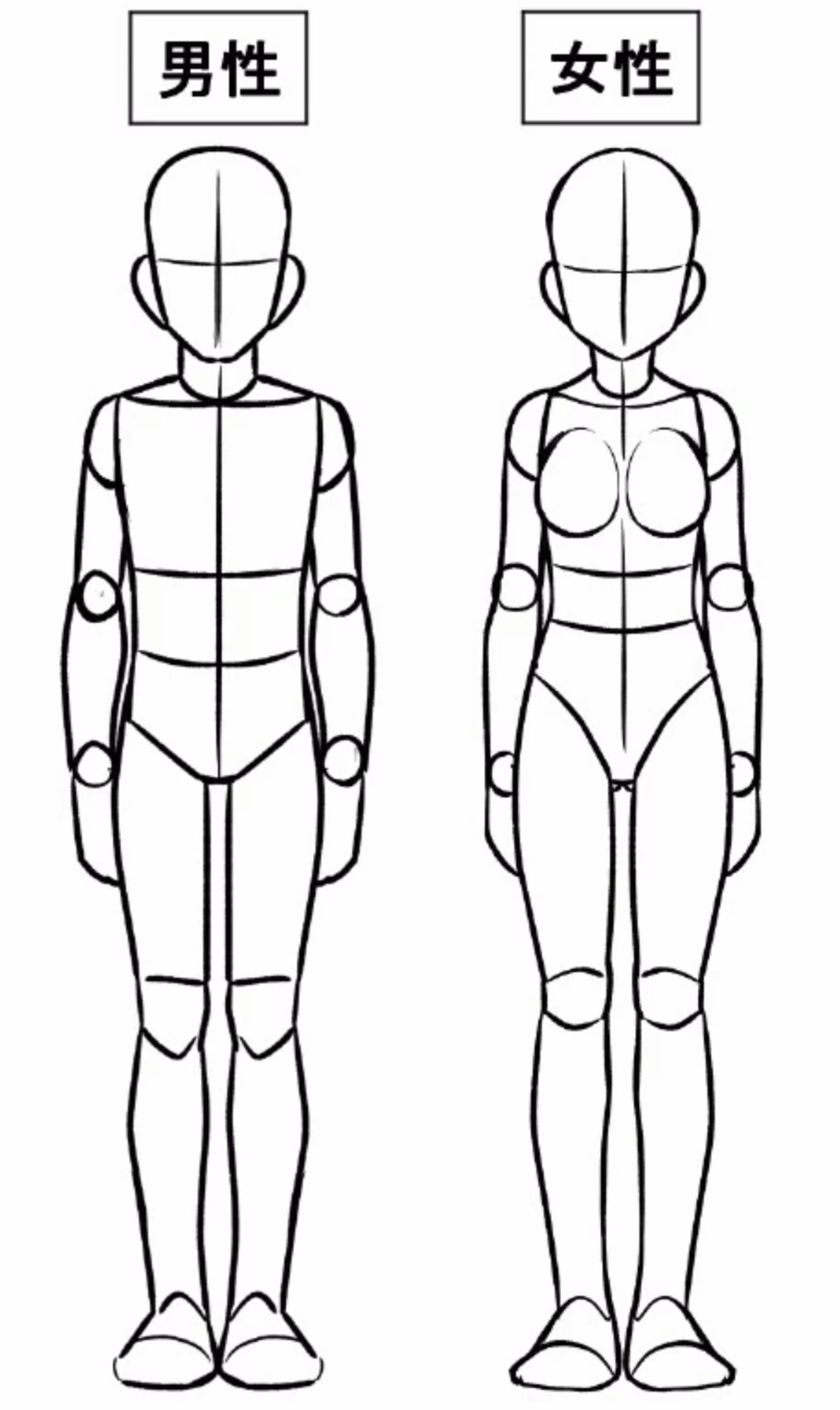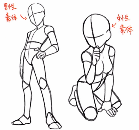 우선 남성과 여성의 차이에서 남성은 근육질로 여성은 부드러운 지방질로 표현되는 경향이있다. 혹은 삼각형과 역삼각형을 많이 알고 있을텐데 이러한 차이들로인해서 남성과 여성을 표현할 수 있다. 과거 데포르메 내역에서도 설명했듯이 이러한 표현들을 직선과 곡선을 이용한 차이로 나타냈는데 우선 여기에선 소체에대한 특성이 주가됨으로 소체애대하서 나열해보자.