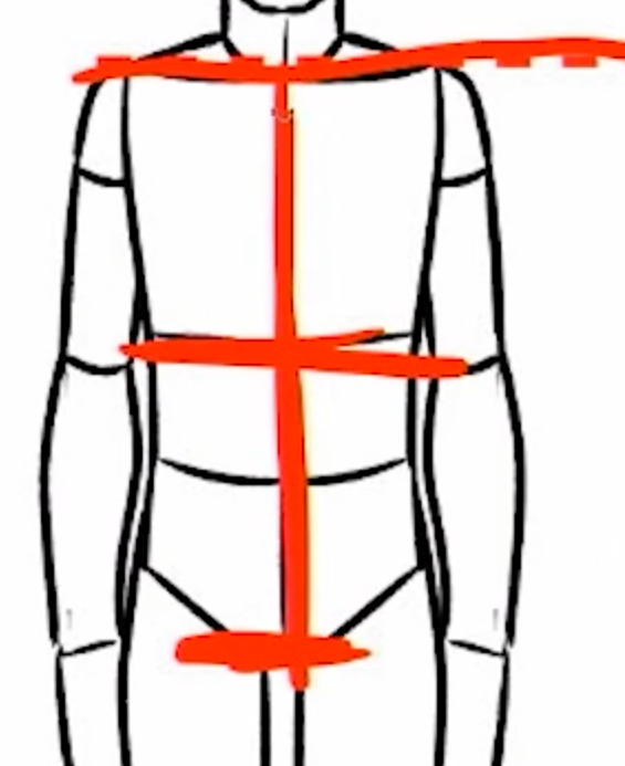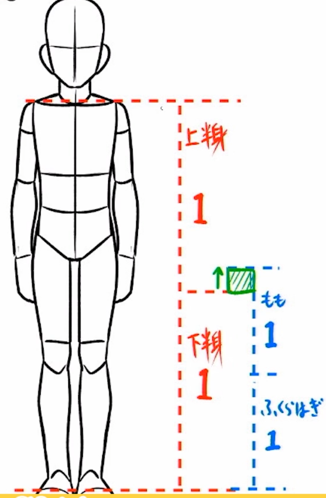 그럼 위쪽은 상반신 아래는 하반신으로 이루어지며, 아래를 다시 2등분하여 허벅지와 종아리로 나누는 방식으로 작성한다.