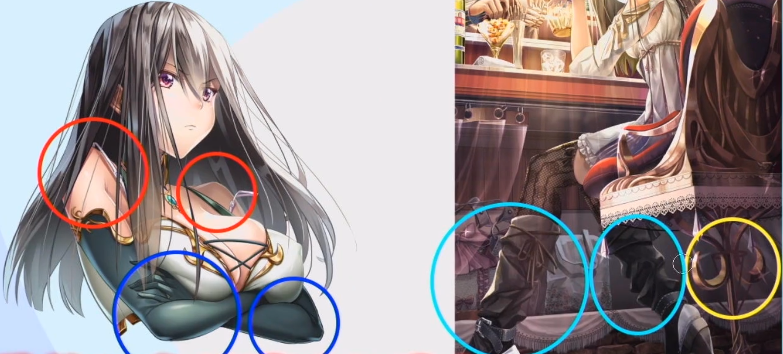 왼쪽 그림에서 빨간색 친부분의 차이 파란색 친부분의 차이가 보이는가?