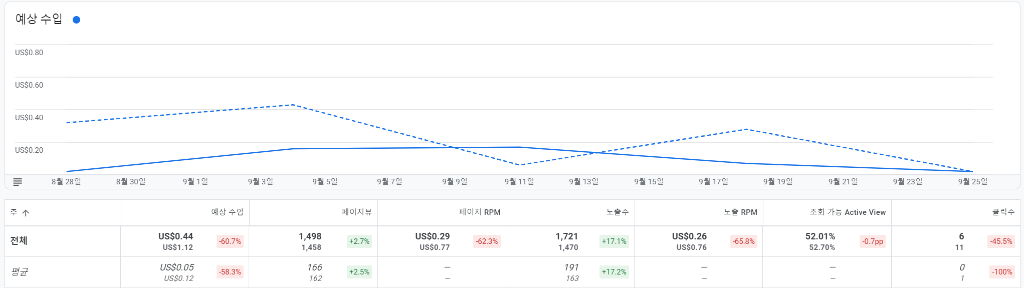 방문자가 늘었으니 당연히 뷰도 늘었을 것을 예상할 수 있지만, 수익이 상대적으로 줄었다는걸 알수 있다.