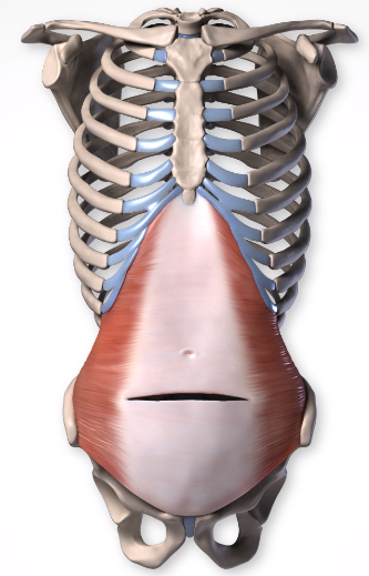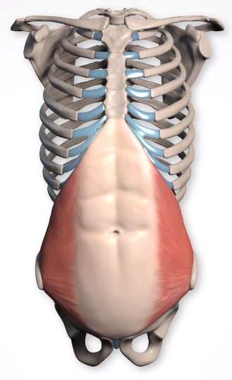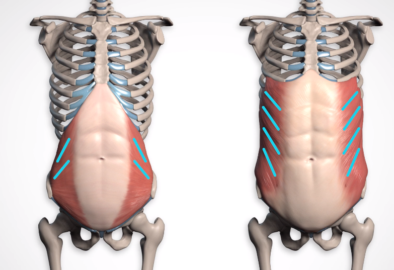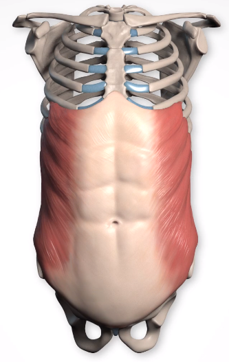 Function: 복벽을 지지하고 숨을 내쉴 때 횡격막에 대항하는 힘으로 작용합니다. 또한 몸통을 앞으로 구부리는 데 도움이 될 수 있습니다. 한쪽이 수축하면 몸통이 옆으로 구부러지면서 회전합니다. 구부러진 반대쪽에서는 어깨는 앞쪽으로 가져옵니다.( 잘 이해가 안갈수도있지만, 한쪽을 구부리면 앞쪽으로 뒤틀려서 숙여짐으로, 어깨가 나오는 자세가됩니다)