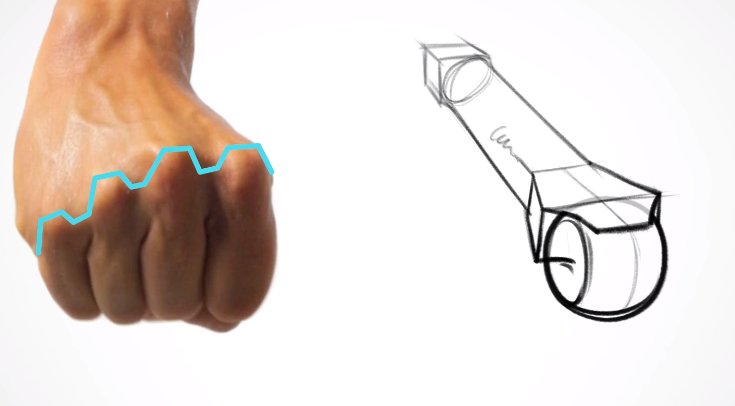 이때 중요한 부분이 몇가지있는데 구부러진 사각 상자라는 점입니다. 이 구부러짐은 중지에서 가장 높으며, 주먹을 만들어 정면에서 바라보면 중지부분이 가장 위로 솟아 나있는 것을 확인 할 수 있습니다.