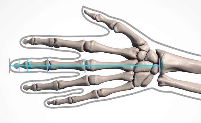 손 뼈의 비율에대해 알아보자면 손뼈는 손목에서 중지의 길이가 두개골에서 턱까지의 길이와 같습니다.