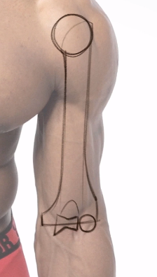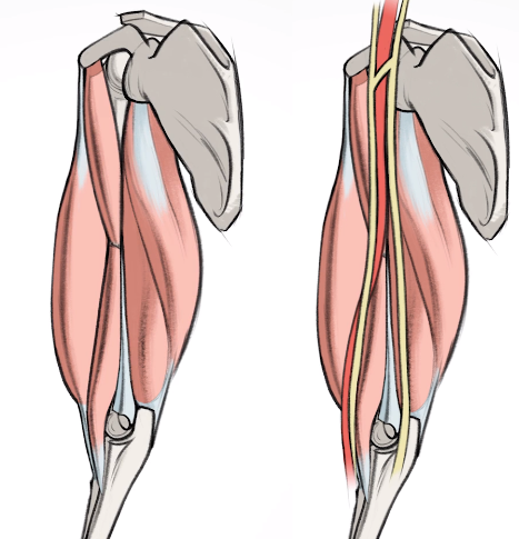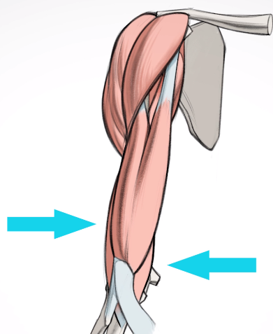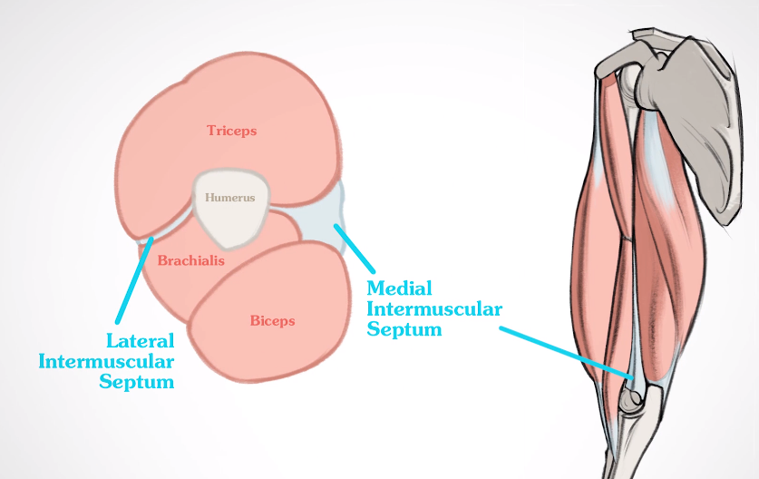 상완신근의 내측에는 intermuscular septa 라는 힘줄다발이있습니다. 이러한 다발로인해서 팔의 전면근육과 후면 근육을 나누는직선 라인을 볼 수 있습니다.