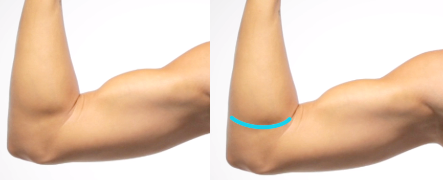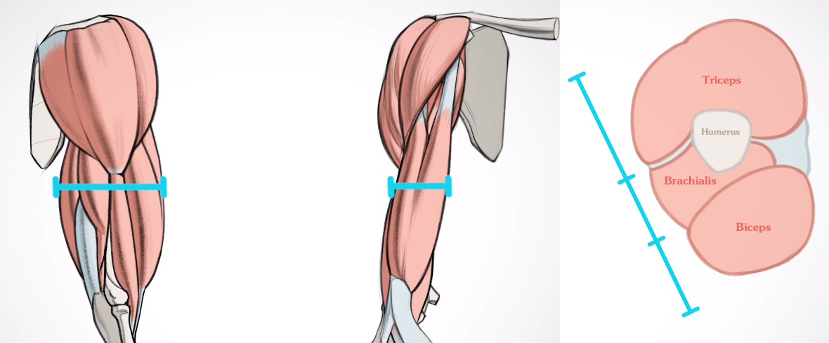 Form: 상완근은 바깥쪽이 크고 안쪽이 작습니다. 팔 바깥쪽에서 더 잘 보입니다. 구부리면 타원형으로 나타납니다.